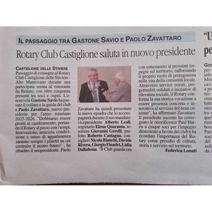 Una serata partecipata e ricca di significato ha segnato il passaggio di consegne al Rotary Club Castiglione delle Stiviere, che ha salutato l’avvio del nuovo anno rotariano con l’insediamento del nuovo presidente Paolo Zavattaro.